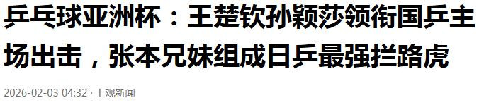 上观新闻《乒乓球亚洲杯:王楚钦孙颖莎领衔国乒主场出击,张本兄妹组成日乒最强拦路虎》发布时间:2026.2.3